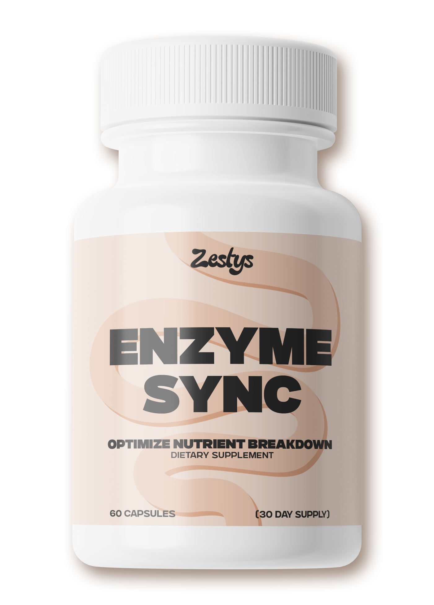Supplement bottle labeled 'Enzyme Sync' by Zestys on a white background OTHERS